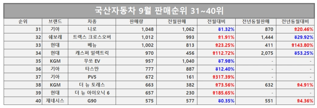 국산차 9월 판매순위 31~40위