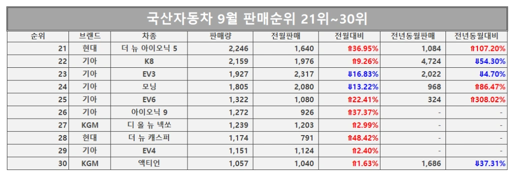 국산차 9월 판매순위 21~30위