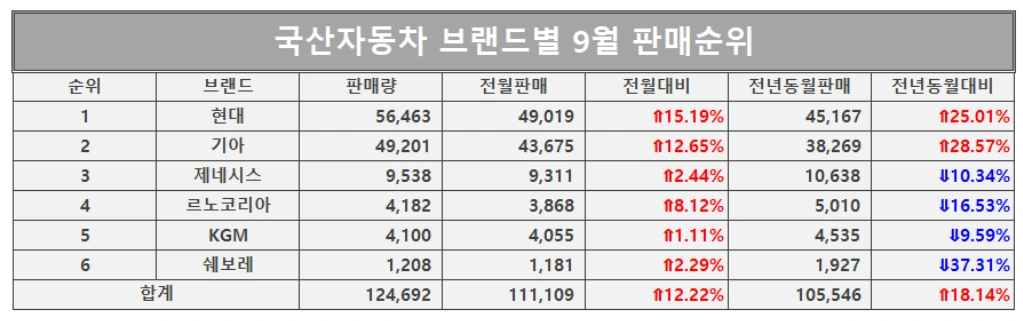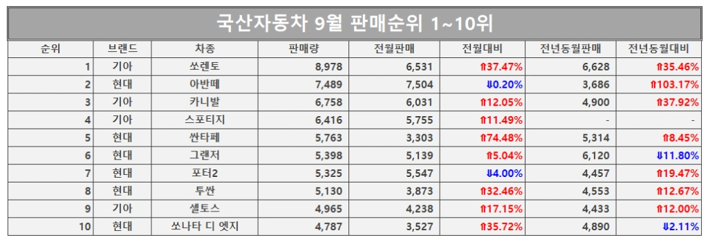 국산차 9월 브랜드별 판매 순위