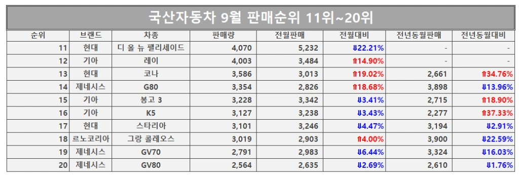 국산차 9월 판매순위 11~20위