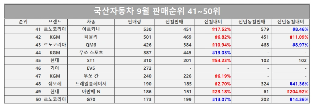국산차 9월 판매순위 41~50위
